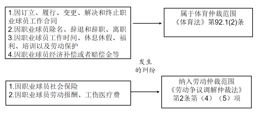 (1)因確認(rèn)身份而引起糾紛,依照請(qǐng)求內(nèi)容不同,分別納入勞動(dòng)仲裁、體育仲裁范圍
