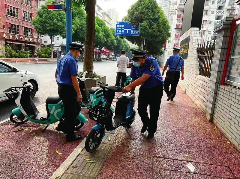 執(zhí)法人員整治未按規(guī)定停放的共享電單車(chē)(青秀區(qū)城市管理綜合行政執(zhí)法隊(duì)供圖)