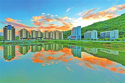 城市西區(qū)一角,晚霞與城市建筑倒映水面,頗有詩意。 記者 王瀘州 攝