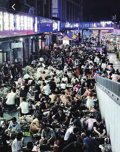 在熱門打卡地,大約晚上7時(shí),燒烤店門口排了幾百米的長(zhǎng)龍,有人帶著馬扎,還有人帶著零食,交警在街頭路口維持秩序。來自江蘇的游客說:“當(dāng)?shù)嘏笥严挛?時(shí)多就來幫忙排隊(duì)了,現(xiàn)在終于吃上了。”不一會(huì)兒,燒烤店負(fù)責(zé)人拿起了小喇叭:“手里沒菜單的別排隊(duì)了,店里沒肉了。”