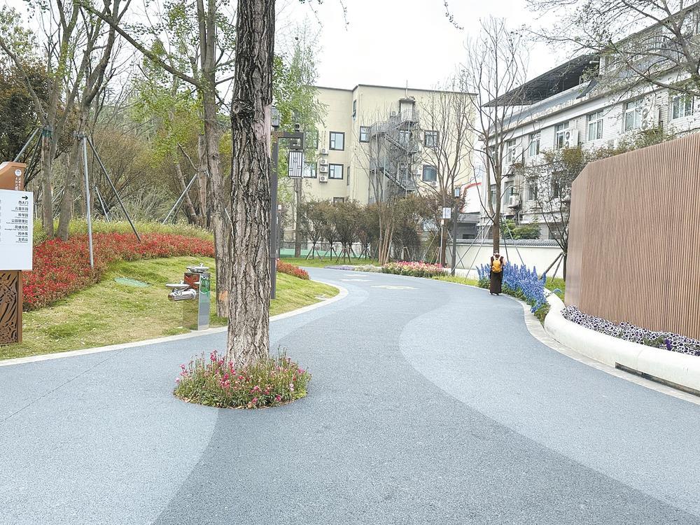 文化公園內(nèi),花叢修剪整齊、綠道干凈整潔