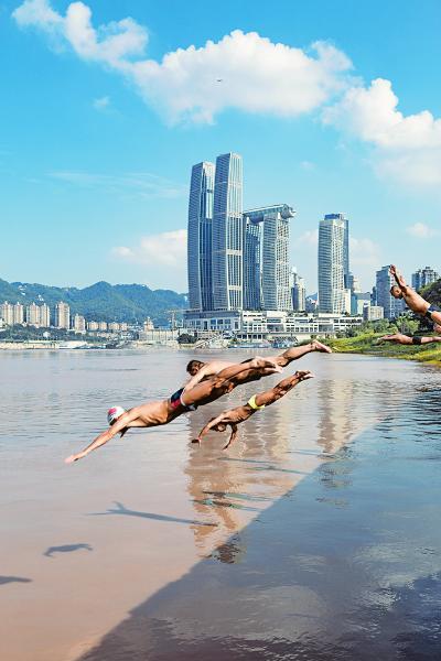 江邊“起飛” 重慶梁沱冬泳義務(wù)救援基地,游泳愛好者在練習(xí)跳水。