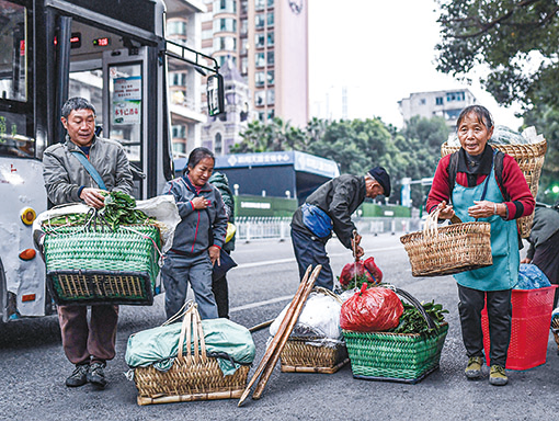 菜農(nóng)在貴陽市大營坡終點站下車,準備將蔬菜就近售賣(11月7日攝)。