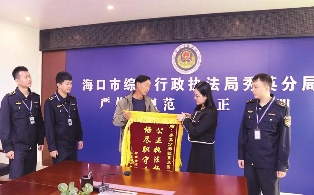11月27日,河南籍民工朱先生向海口市綜合行政執(zhí)法局秀英分局贈(zèng)送錦旗。林小映 攝