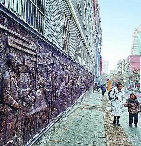 新增的一組浮雕墻、雕塑等生動(dòng)展現(xiàn)烏魯木齊市明德路的歷史。圖為1月6日,一位居民帶著孩子從浮雕墻前經(jīng)過。