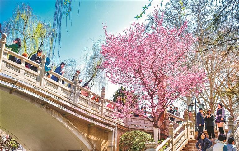 城墻下,紅葉李滿樹繁花,小巧而密集的粉白色花瓣簇擁著嫩黃的花蕊,吸引了大量游人前來觀賞,感受歷史韻味與春日風情的交融。候鳥歸來,或在護城河水面嬉戲,或忙著銜枝筑巢。