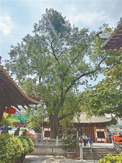 到了宋代,“光孝菩提”被列為“羊城古八景”之一。如今,六祖殿前,菩提榕生機勃勃,樹影婆娑。需要指出的是,今日光孝寺的菩提榕并非千年前的首棵菩提榕。這里另有故事。清嘉慶年間,智藥三藏手植的菩提榕被大風(fēng)刮倒,搶救無效。寺僧從南華寺取菩提榕枝條植于光孝寺。兩地菩提榕本出一脈,南華寺的菩提榕是早期從智藥三藏手植的菩提榕上取枝條種植而成的,系“子枝”;如此,今日光孝寺的菩提榕可謂是“孫枝”。