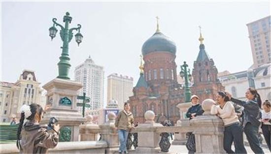黑龍江省哈爾濱市,游客在索菲亞教堂附近游玩。哈爾濱市有“萬國建筑博物館”的美譽,當(dāng)?shù)赝诰驓v史底蘊,塑造城市發(fā)展新高度。新華社記者 謝劍飛攝