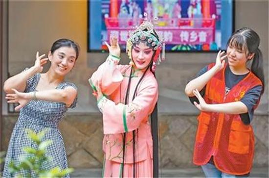 福建省福州市鼓樓區(qū)安泰街道綜合文化站,閩劇演員(中)教授表演技藝。當(dāng)?shù)赝苿印肮咆?非遺+展演”等多元化發(fā)展,有效傳播閩都“?!蔽幕瑯?gòu)建“15分鐘幸福生活圈”,讓市民和游客感受非遺之美。謝貴明攝(人民視覺)