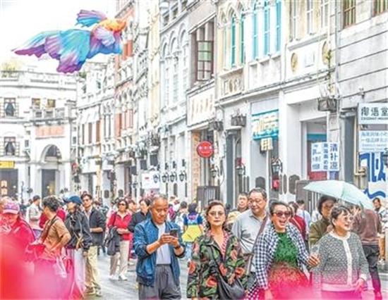 海南省海口市打造特色文化品牌,騎樓老街經(jīng)過改造升級,成為休閑娛樂好去處。圖為游客在騎樓老街游玩??档橇軘z(人民視覺)