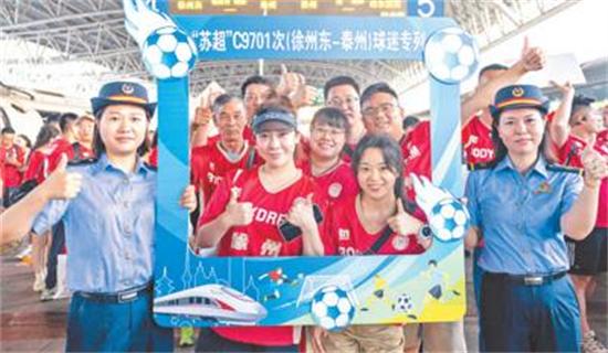 江蘇省城市足球聯(lián)賽(“蘇超”)期間,多部門提供“球迷專列”等便民服務(wù)。城市用精細服務(wù)傳遞文明理念,市民用高素質(zhì)行為反哺城市形象。圖為球迷乘坐C9701次專列到達泰州站后留影。湯德宏攝(影像中國)