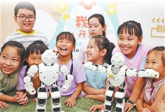山東省東營市東營區(qū)辛店街道明珠社區(qū),小朋友學(xué)習(xí)機器人操作方法??破战逃M社區(qū),進一步提升居民科學(xué)素養(yǎng)。劉智峰攝(影像中國)