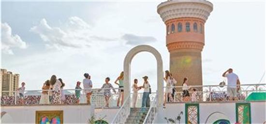 游客在新疆維吾爾自治區(qū)烏魯木齊市新疆國際大巴扎景區(qū)拍照。該景區(qū)匯聚了新疆各地特色商品、美食和民俗文化表演。孫振嵩攝(影像中國)
