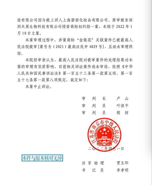 如4月1日,江蘇南京中院基于“金銀花”關聯(lián)案件已被最高法提審,決定中止審理上訴人南京三盾藥業(yè)有限公司、青島海氏海諾英諾威消毒科技有限公司與被上訴人上海碧麗化妝品有限公司案?!白罡呷嗣穹ㄔ簩μ釋彴讣奶幚斫Y果對本案的審理有實質(zhì)影響,目前相關訴訟案件尚未審結,依法裁定本案中止訴訟?!辈枚〞Q。