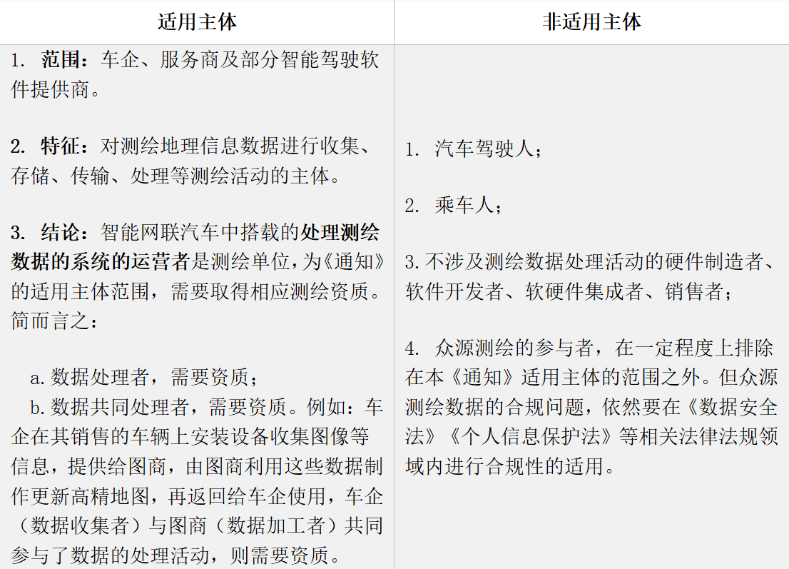 按照目前的市場情況來看,《通知》規(guī)范的主體主要為車企、服務商及部分智能駕駛軟件提供商,而對于僅獲得輔助駕駛等服務的智能網(wǎng)聯(lián)汽車駕乘人員,則不屬于有關(guān)測繪活動的行為人。