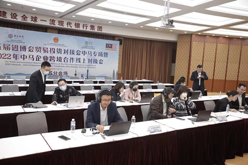 為進(jìn)一步豐富第五屆進(jìn)博會(huì)對(duì)接活動(dòng)主題,促進(jìn)中國和馬來西亞兩國間的經(jīng)貿(mào)投資往來,中國銀行與中國駐馬來西亞大使館、馬來西亞中華總商會(huì)共同舉辦了“第五屆進(jìn)博會(huì)貿(mào)易投資對(duì)接會(huì)中馬專場暨2022年中馬企業(yè)跨境撮合線上對(duì)接會(huì)”(以下簡稱“中馬對(duì)接會(huì)”),邀請(qǐng)客戶依托“惠如愿·中銀e企贏”平臺(tái)開展線上視頻洽談。江蘇中行積極落實(shí)總行工作部署,設(shè)立了南京、淮安兩處分會(huì)場,邀約了近30家中小企業(yè)客戶參加“中馬對(duì)接會(huì)”。
