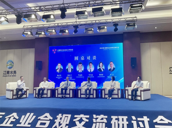 在合規(guī)主題圓桌對談環(huán)節(jié),賽尼爾法務(wù)智庫總裁葉小忠、北京金杜律所高級顧問董嬌嬌、江南水務(wù)副總經(jīng)理陸慶喜、江蘇泰和律所管委會主任李遠(yuǎn)揚(yáng)、江陰市企業(yè)法治工作協(xié)會會長蔡磊五位嘉賓,分別立足各自領(lǐng)域,圍繞會議主題深入探討,交流思想、分享經(jīng)驗。