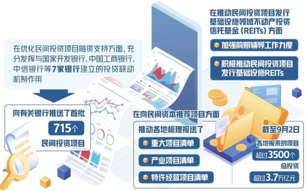 為貫徹落實《意見》,國家發(fā)展改革委印發(fā)了《關(guān)于進一步抓好抓實促進民間投資工作努力調(diào)動民間投資積極性的通知》,提出了17項有針對性的具體措施。據(jù)介紹,在優(yōu)化民間投資項目融資支持方面,充分發(fā)揮與國家開發(fā)銀行、中國工商銀行、中信銀行等7家銀行建立的投貸聯(lián)動機制作用,向有關(guān)銀行推送了首批715個民間投資項目,請有關(guān)金融機構(gòu)按照市場化、法治化原則,自主選擇符合條件的項目給予金融支持。在向民間資本推薦項目方面,推動各地梳理報送了重大項目清單、產(chǎn)業(yè)項目清單、特許經(jīng)營項目清單。截至9月2日,各地報來的項目超過3500個,總投資超過3.7萬億元。在推動民間投資項目發(fā)行基礎設施領域不動產(chǎn)投資信托基金(REITs)方面,加強前期輔導工作力度,積極推動民間投資項目發(fā)行基礎設施REITs。近日,國家發(fā)展改革委向證監(jiān)會推薦了金風科技風力發(fā)電項目,這是推薦的首單民間投資清潔能源REITs項目。