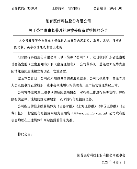 4月7日晚間,陽普醫(yī)療(300030.SZ,股價5.5元,市值17.01億元)公告,于近日收到廣東省監(jiān)察委員會簽發(fā)的《立案通知書》和《留置通知書》,公司董事長、總經(jīng)理鄧冠華因涉嫌違紀違法被立案調(diào)查、實施留置。截至公告日,公司尚未知悉調(diào)查的進展及結(jié)論。公司其他董事、高級管理人員及監(jiān)事均正常履職,董事會依法履行相關(guān)職責,生產(chǎn)經(jīng)營管理情況正常。