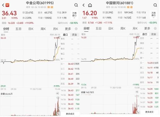 2月26日午后,中金公司和中國銀河合并傳聞再起,兩家公司股價雙雙異動,其中兩家公司A股股價均在半小時內(nèi)快速漲停,中金公司A股收報36.43元/股,中國銀河A股收報16.2元/股;港股方面,中金公司收報16.22港元/股,漲19.09%;中國銀河收報8.76港元/股,漲17.11%。