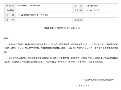 公告內(nèi)容顯示,張亮因違反《中華人民共和國(guó)證券投資基金法》《證券市場(chǎng)禁入規(guī)定》,被責(zé)令改正,并被沒收違法所得1566.26萬(wàn)元,以及被處以1566.26萬(wàn)元罰款,被采取10年證券市場(chǎng)禁入措施。