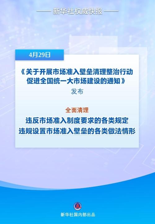 國家發(fā)展改革委會同商務(wù)部、市場監(jiān)管總局29日發(fā)布《關(guān)于開展市場準(zhǔn)入壁壘清理整治行動 促進(jìn)全國統(tǒng)一大市場建設(shè)的通知》,進(jìn)一步大力破除市場準(zhǔn)入壁壘,全面清理和整改違規(guī)設(shè)置市場準(zhǔn)入壁壘的各類不合理規(guī)定和做法,建立健全線索歸集、核實(shí)整改、案例通報(bào)等長效機(jī)制,讓“非禁即入”落地生根,營造公平的市場準(zhǔn)入環(huán)境。