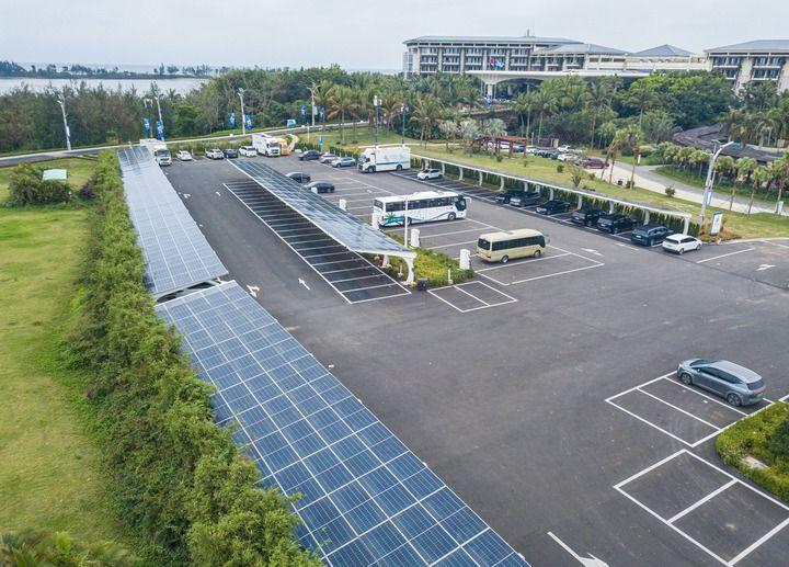 2025年3月16日在海南博鰲零碳示范區(qū)拍攝的建有光伏發(fā)電設(shè)備的停車場(無人機照片)。新華社記者 蒲曉旭 攝