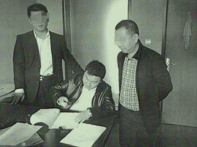 樂山市商業(yè)銀行兩名工作人員與假冒擔保方銀行工作人員的殷學明(中)在“面簽”現(xiàn)場。受訪者提供 資料圖