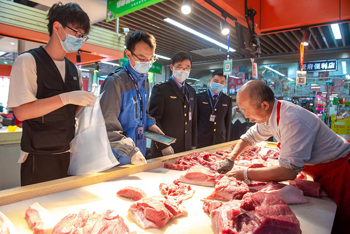 愛府路農(nóng)貿(mào)市場現(xiàn)場抽取豬肉封裝。明光市市場監(jiān)督管理局供圖