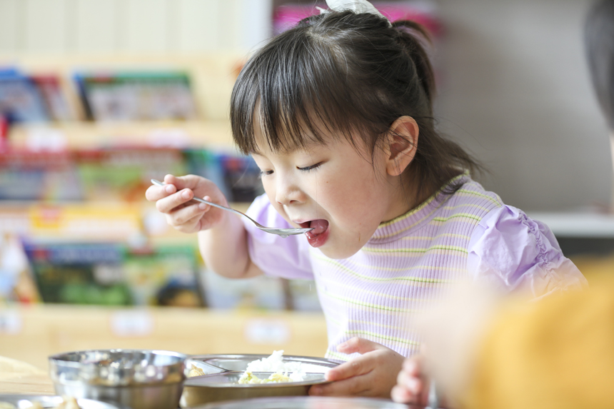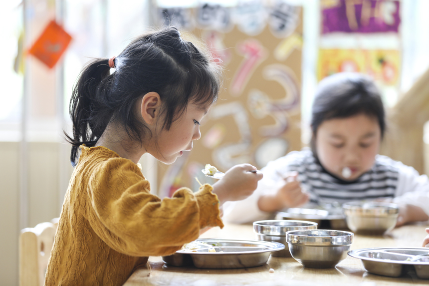 5月22日,江西省撫州市南豐縣市山鎮(zhèn)第一幼兒園的小朋友在吃午餐。近年來,南豐縣推行農(nóng)村學(xué)前教育兒童營養(yǎng)改善計劃,參照“均衡營養(yǎng),科學(xué)膳食”的標(biāo)準(zhǔn),結(jié)合學(xué)前幼兒飲食習(xí)慣,制定每周菜譜,嚴(yán)控食品安全關(guān),確保營養(yǎng)膳食搭配,讓學(xué)前幼兒吃得飽、吃得好、吃得健康。(謝東)