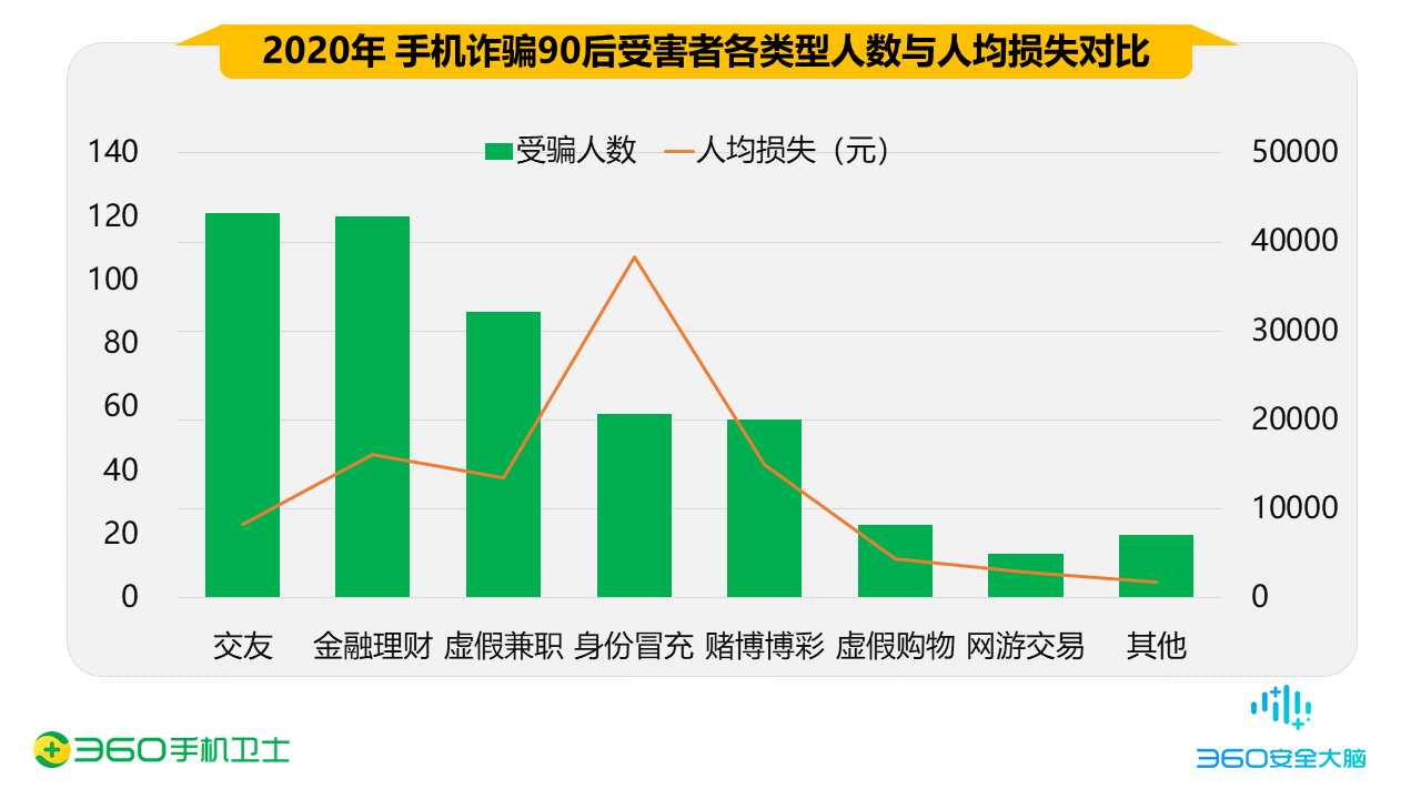 《2020年中國手機安全狀況報告》顯示,在網(wǎng)絡(luò)詐騙舉報用戶中,90后的手機詐騙受害者占所有受害者總數(shù)的37.5%,是不法分子從事網(wǎng)絡(luò)詐騙的主要受眾人群;其次是00后,占比為28.7%;80后占比為24.1%。而在人們印象中更容易遭受手機詐騙的70后和60后人群,僅占比不到10%。