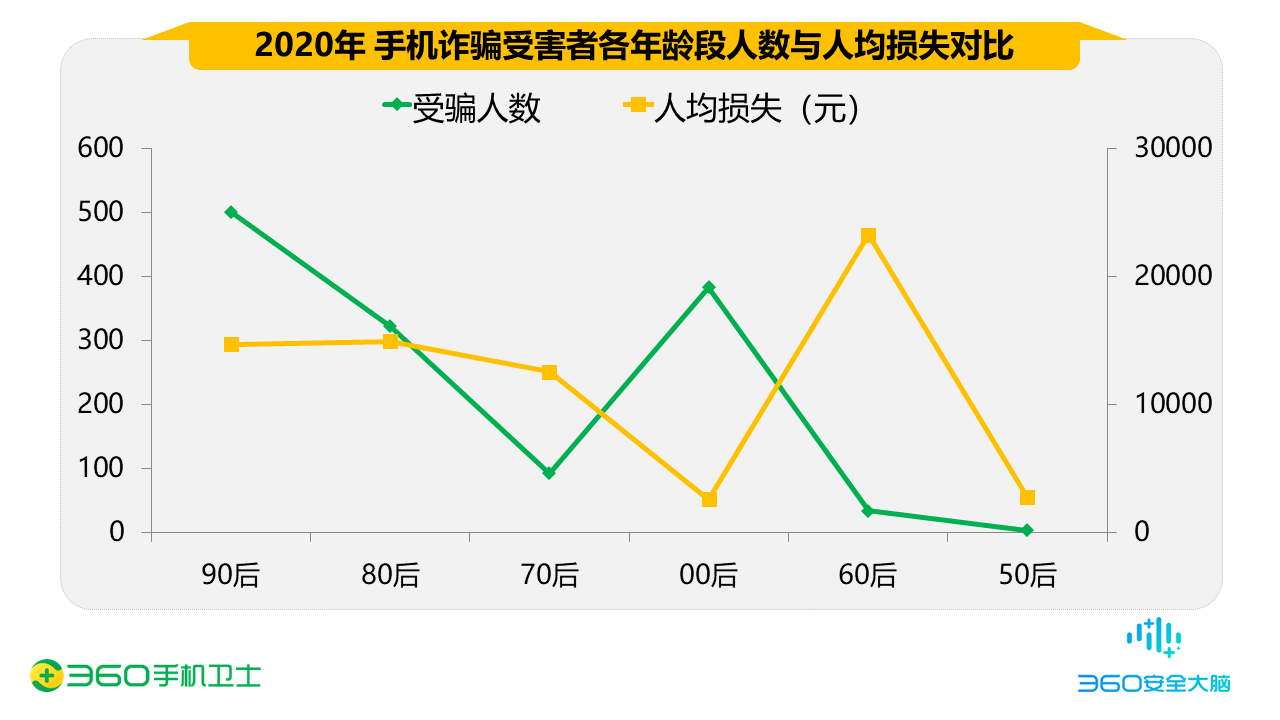然而,90后雖然受騙人數(shù)較多,但人均損失較低。60后一旦落入網(wǎng)絡(luò)騙局,則會損失慘重,人均損失超過兩萬元。
