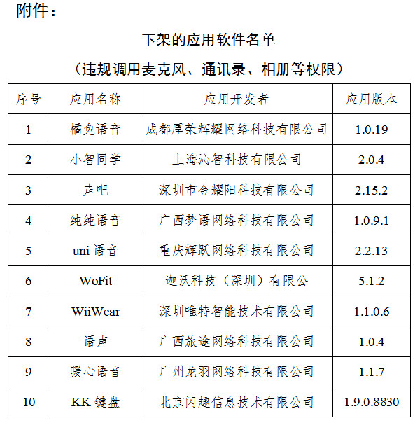 依據(jù)《網(wǎng)絡(luò)安全法》和《移動智能終端應(yīng)用軟件預(yù)置和分發(fā)管理暫行規(guī)定》(工信部信管〔2016〕407號)等法律和規(guī)范性文件要求,工信部組織對上述10款A(yù)PP進(jìn)行下架。相關(guān)應(yīng)用商店應(yīng)在本通報發(fā)布后,立即組織對名單中應(yīng)用軟件進(jìn)行下架處理。