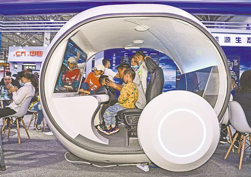 5月27日,孩子們在“數(shù)博會(huì)”上通過虛擬電動(dòng)車體驗(yàn)綠色出行。