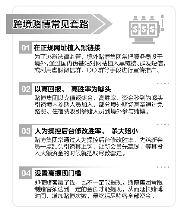 跨境賭博“逢賭必輸”,網(wǎng)絡(luò)賭博“陷阱重重”。近年來,跨境賭博形式多樣,套路層出不窮,無數(shù)民眾或主動或被動地身陷其中。今年3月1日起,《刑法修正案(十一)》正式施行,跨境賭博首次寫進刑法,這意味著今后,國家將對此從嚴從重打擊。
