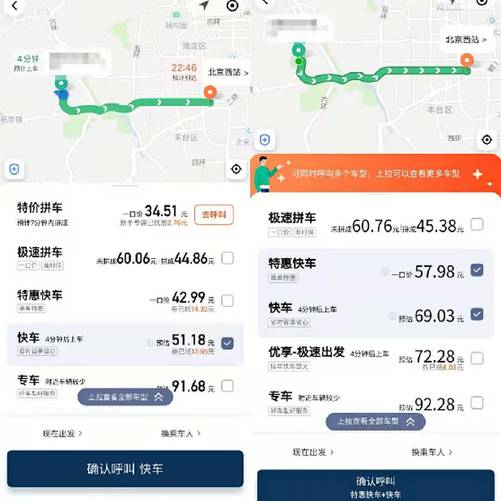 ——記者在某網(wǎng)約車平臺上搜索發(fā)現(xiàn),在同一時間于同一地點出發(fā)至北京西站,經(jīng)常使用該網(wǎng)約車平臺的用戶手機內(nèi)顯示的快車打車費用預估為69.03元。但不經(jīng)常使用該平臺的用戶手機上顯示,打車費用預計為51.18元,其中包含了17.05元被抵扣的優(yōu)惠券。但記者發(fā)現(xiàn),即便不選擇使用優(yōu)惠券抵扣車費,不經(jīng)常使用該平臺的用戶打車費用是68.23元,比常用用戶顯示的車費還便宜0.8元。