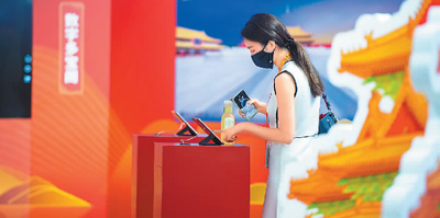 在由故宮博物院主辦、騰訊協(xié)辦的“文化傳承·數(shù)字共享”數(shù)字故宮體驗專區(qū),推出了“數(shù)字文物”“數(shù)字考古”“數(shù)字服務(wù)”三大板塊,全方位展示了故宮20多年來的數(shù)字化成果。圖為9月1日,國家會議中心展館內(nèi),與會人員在體驗故宮博物院的創(chuàng)意設(shè)備。 |
