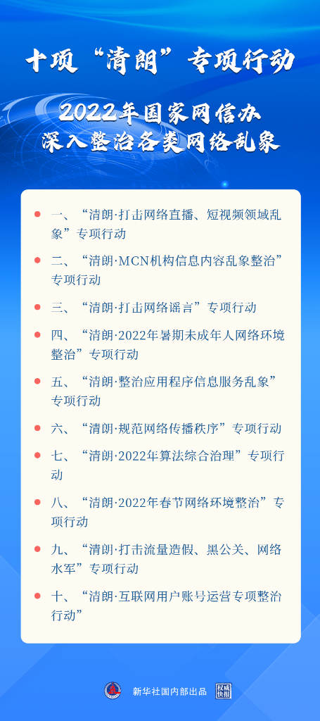 新華社北京3月17日電(記者王思北)記者17日從國新辦舉行的新聞發(fā)布會獲悉,2022年“清朗”系列專項行動將重點(diǎn)開展打擊網(wǎng)絡(luò)謠言,打擊網(wǎng)絡(luò)直播、短視頻領(lǐng)域亂象,算法綜合治理,暑期未成年人網(wǎng)絡(luò)環(huán)境整治等十方面任務(wù)。