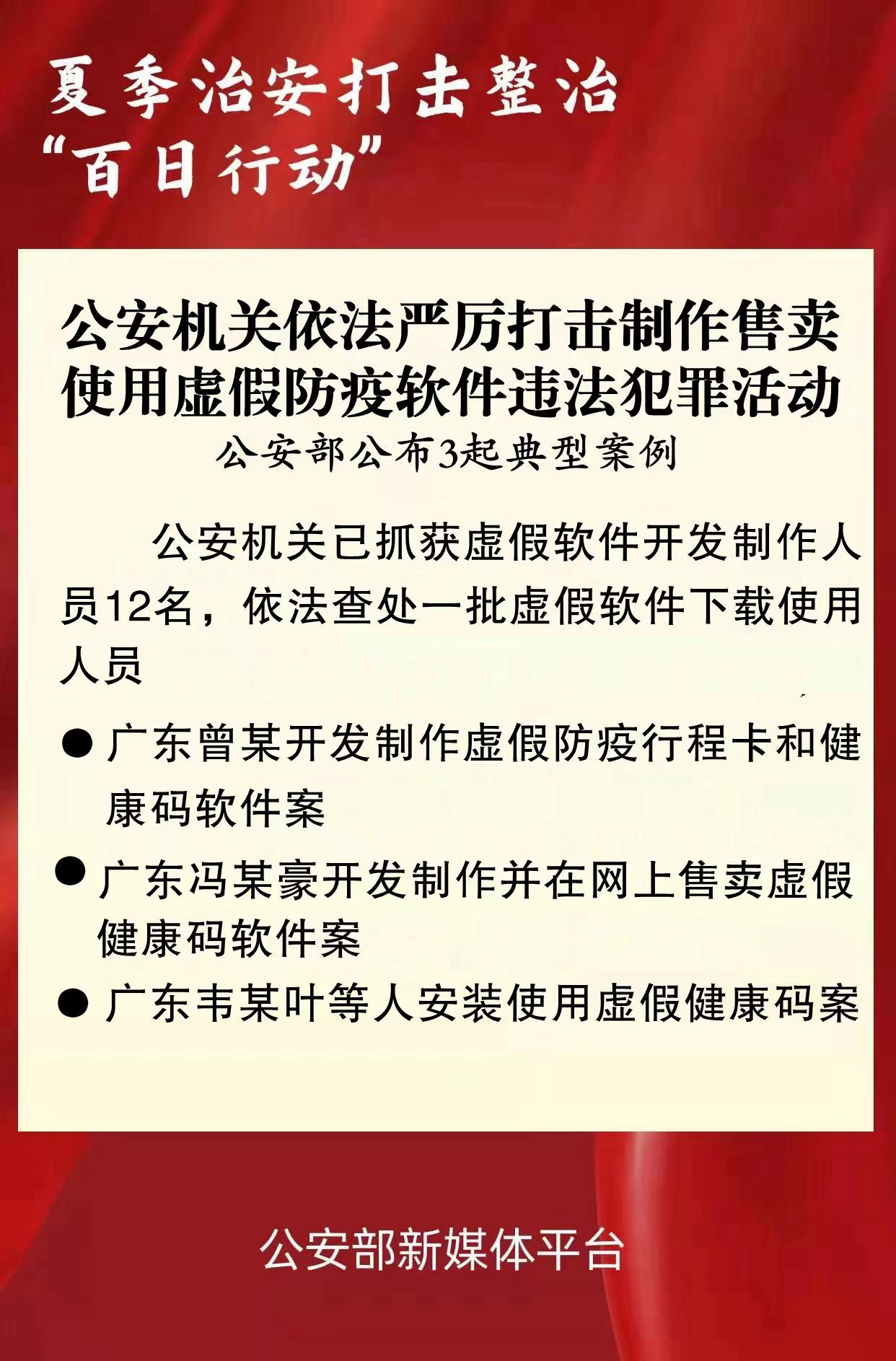 人民網(wǎng)北京8月8日電 (記者郝萍、梁秋坪)記者今天從公安部獲悉,近日,在全國公安機(jī)關(guān)夏季治安打擊整治“百日行動”中,公安網(wǎng)安部門偵破一批開發(fā)制作、發(fā)布售賣、下載使用虛假防疫軟件案件,及時(shí)消除相關(guān)涉疫風(fēng)險(xiǎn)隱患。