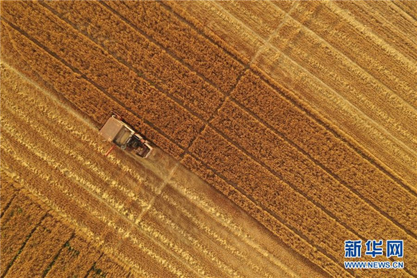 6月13日無(wú)人機(jī)拍攝的雄安新區(qū)大王鎮(zhèn)小王村成熟的麥田。 近日,雄安新區(qū)小麥陸續(xù)成熟,當(dāng)?shù)卮迕駬屪マr(nóng)時(shí)進(jìn)行收獲。 新華社記者 朱旭東 攝