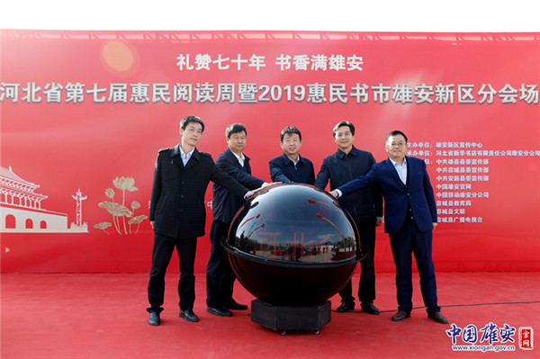 10月26日,河北省第七屆惠民閱讀周暨2019惠民書(shū)市雄安分會(huì)場(chǎng)啟動(dòng)儀式現(xiàn)場(chǎng),出席活動(dòng)領(lǐng)導(dǎo)共同按下啟動(dòng)球。中國(guó)雄安官網(wǎng)陳凱昆 攝