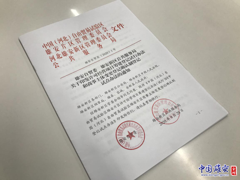 《中國(河北)自由貿易試驗區(qū)雄安片區(qū)許可經營項目籌建登記辦法(試行)》《中國(河北)自由貿易試驗區(qū)雄安片區(qū)商事主體變更登記確認制登記試點辦法》印發(fā)。中國雄安官網記者毛鶴然 攝