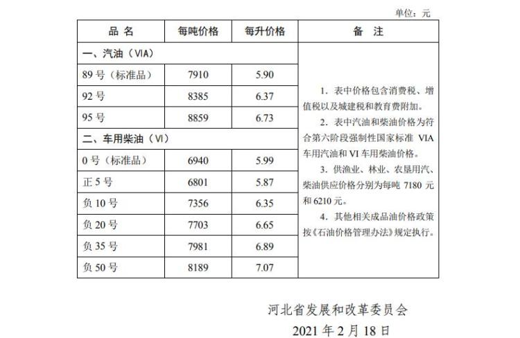 2月18日,河北省發(fā)展和改革委員會發(fā)布《關(guān)于調(diào)整我省成品油價格的公告》。根據(jù)現(xiàn)行成品油價格形成機(jī)制,自2021年2月18日24時起,河北省汽、柴油價格(標(biāo)準(zhǔn)品)每噸分別提高275元、265元,調(diào)整后的汽、柴油最高零售價格見下表。乙醇汽油價格按同標(biāo)號汽油(VIA)價格執(zhí)行,普通柴油價格按照同標(biāo)號車用柴油(VI)價格執(zhí)行,98號汽油價格由成品油生產(chǎn)經(jīng)營企業(yè)根據(jù)市場情況自主制定具體價格。(河北日報記者潘文靜)