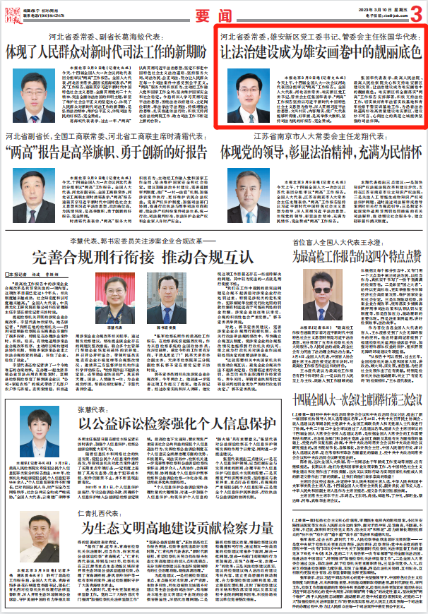 3月10日出版的《檢察日?qǐng)?bào)》刊發(fā)了題為《河北省委常委,雄安新區(qū)黨工委書記、管委會(huì)主任張國華代表: 讓法治建設(shè)成為雄安畫卷中的靚麗底色 》的報(bào)道,一起來看↓↓↓