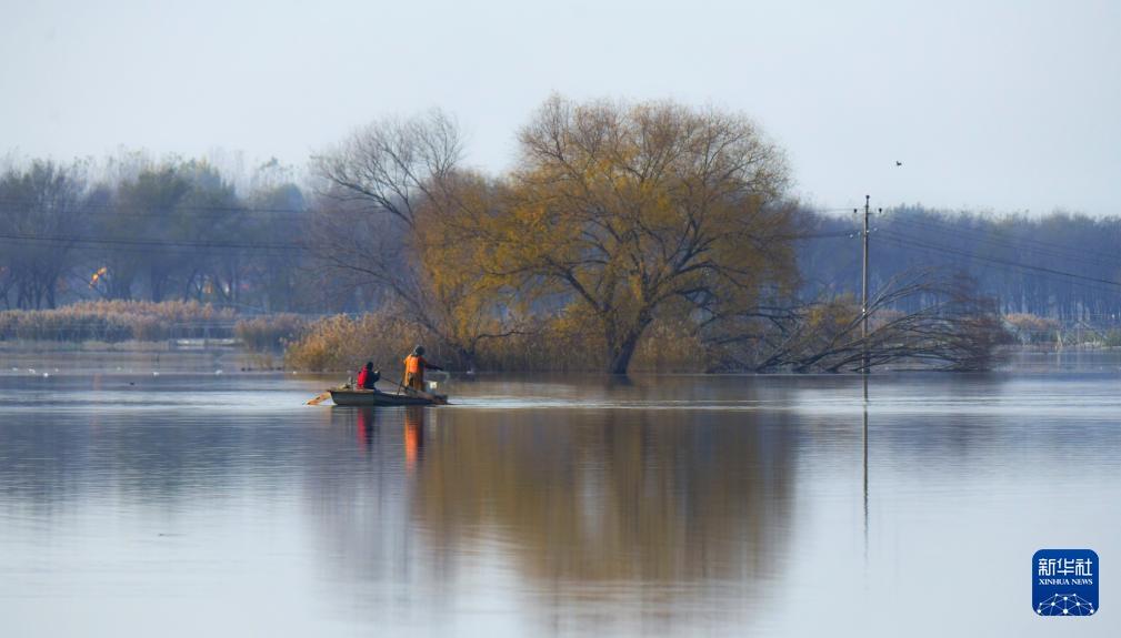 初冬時節(jié),淀邊村民行舟于白洋淀。新華社發(fā)(周龍山 攝)