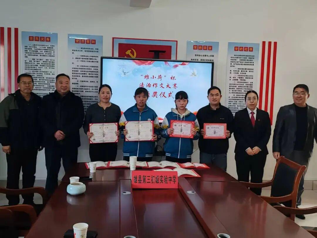 法治的陽(yáng)光,照耀青春成長(zhǎng)之路;文字的力量,承載少年法治夢(mèng)想。10月24日,隨著“雄小荷”杯法治作文大賽評(píng)比結(jié)果的出爐,賽事組委會(huì)帶著榮譽(yù)與成果,相繼走進(jìn)雄縣第二、第三初級(jí)實(shí)驗(yàn)中學(xué)、雄縣第三高級(jí)中學(xué)初中部,為獲獎(jiǎng)師生頒獎(jiǎng)。
