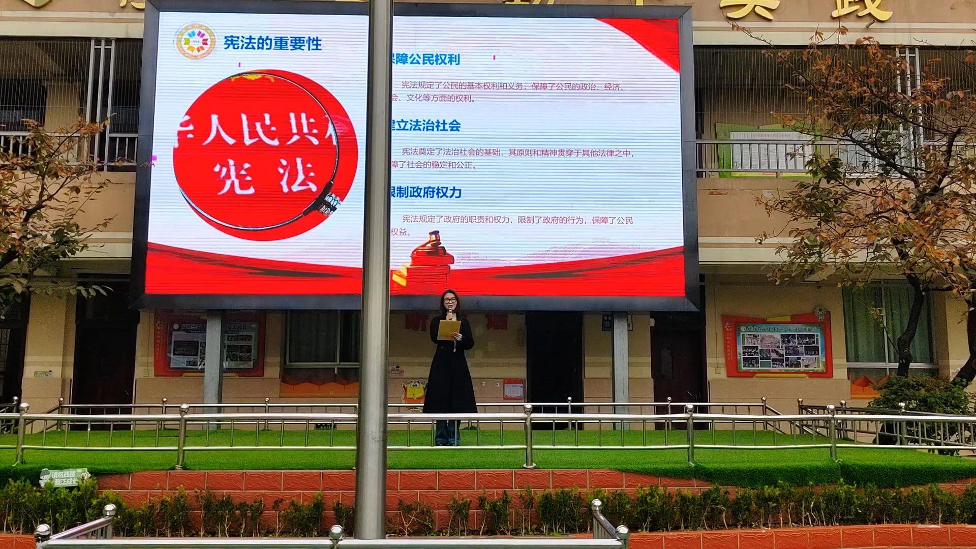 活動現(xiàn)場,法治副校長深入淺出地向?qū)W校師生講解憲法知識,全面闡述了憲法的本質(zhì)、地位、核心內(nèi)容,并探討了憲法與青少年成長的緊密聯(lián)系。期間,學(xué)生代表領(lǐng)讀《中華人民共和國憲法》的重要篇章,并在法治副校長的引領(lǐng)下進行了憲法宣誓。