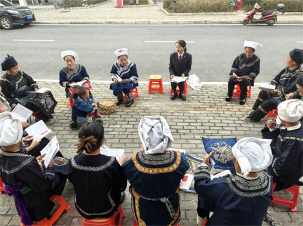 “重婚有違民法典,包辦買賣不對路,朝三暮四不可取,養(yǎng)老育兒是義務(wù)?!崩C娘們創(chuàng)作的普法水歌生動有趣。在雪花湖社區(qū)“繡娘之家”,繡娘們坐在板凳上一邊刺繡一邊興致勃勃地唱著。韋應(yīng)麗介紹說:“在水鄉(xiāng),群眾愛唱歌但識字不多,學(xué)習(xí)法律有困難。所以我們的繡娘不僅要成為矛盾糾紛調(diào)解的行家,更要成為合格的普法員?!崩C娘們將國家法律法規(guī)和政策編排成“調(diào)解歌”“新時代女性歌”“孝老愛親歌”“禁毒防邪歌”等少數(shù)民族山歌,唱給群眾聽,讓大家一聽就懂,多聽還能跟著哼唱,對法律知識更感興趣,真正做到聽得懂、記得住、用得上。