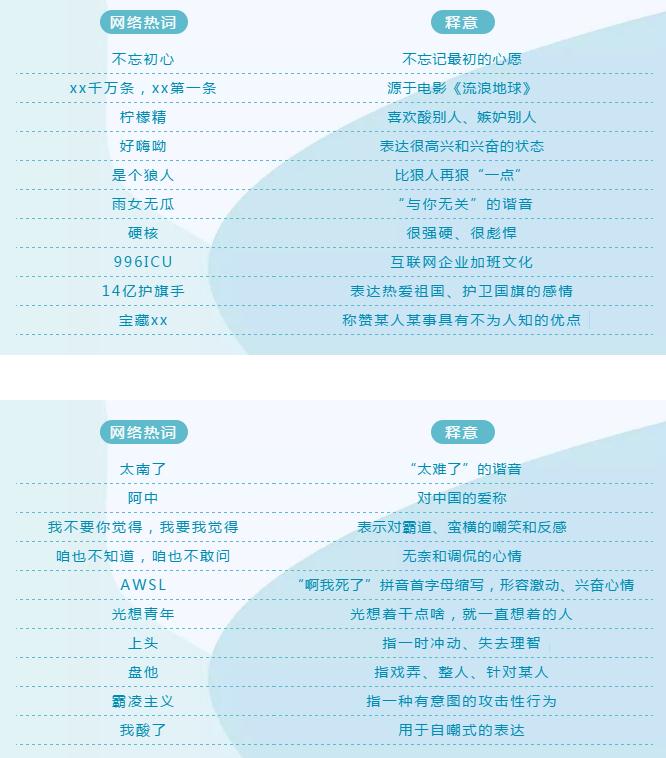 法制網(wǎng)監(jiān)測(cè)中心(ID:fzwyqzx)綜合國(guó)家語(yǔ)言資源監(jiān)測(cè)與研究中心、《咬文嚼字》雜志、《語(yǔ)言文字周報(bào)》等權(quán)威發(fā)布,選取了2019年較有代表性的20個(gè)網(wǎng)絡(luò)熱詞。通過對(duì)這些網(wǎng)絡(luò)熱詞所反映的新特征進(jìn)行分析,總結(jié)我國(guó)網(wǎng)民輿論心態(tài)和網(wǎng)絡(luò)情感變化的四點(diǎn)新趨勢(shì)。