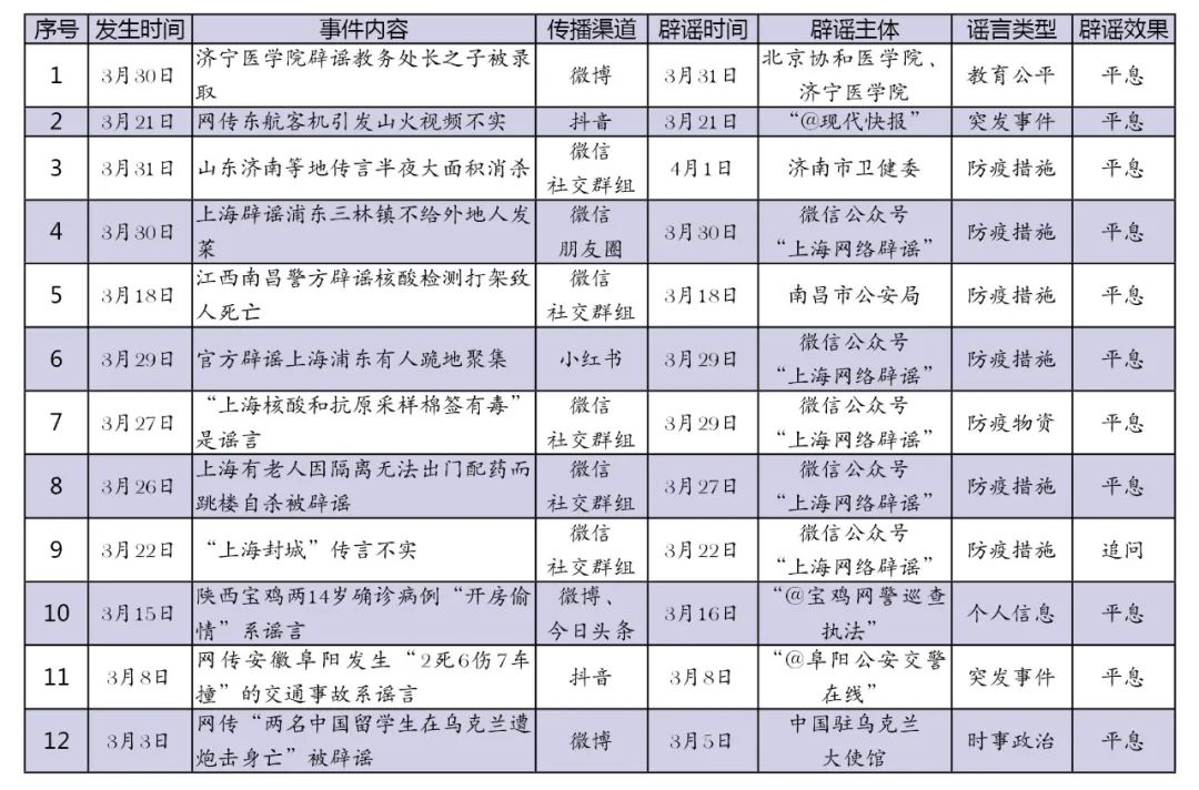 就個案辟謠效果而言,上海網(wǎng)信部門通過專業(yè)人士現(xiàn)身說法,從核酸檢測器材制作流程、生產(chǎn)規(guī)范切入,詳實有據(jù)地澄清謠言,受到輿論的廣泛認可。上海作為疫情嚴峻復(fù)雜地區(qū),也是網(wǎng)絡(luò)謠言的重災(zāi)區(qū),對此,上海市加大辟謠工作力度,組織了由各級警方新媒體賬號,微信公眾號“上海辟謠平臺”“上海網(wǎng)絡(luò)辟謠”及東方網(wǎng)等媒體平臺構(gòu)成的辟謠隊伍,辟謠途徑較為豐富,信息發(fā)布頻率有了顯著增加。但部分謠言辟謠時間超過48小時,個別案例辟謠效果不理想,有些謠言類型重復(fù)出現(xiàn),這些情況表明當?shù)叵嚓P(guān)部門對謠言的應(yīng)對機制還有待進一步完善。